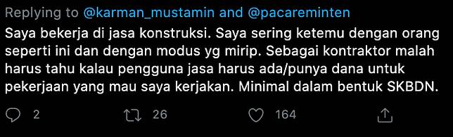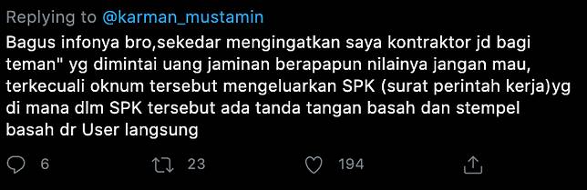 Rekan pencuit sudah menyetor Rp 1 miliar ke sebuah bank, namun dalam bentuk surat jaminan pelaksanaan. Sehingga uangnya tidak langsung disetor ke rekening pelaku. Namun, setelah 21 hari batas maksimum waktu yang dijanjikan, pelaku tiba-tiba beralasan belum bisa menerbitkan Surat Perintah Kerja (SPK).